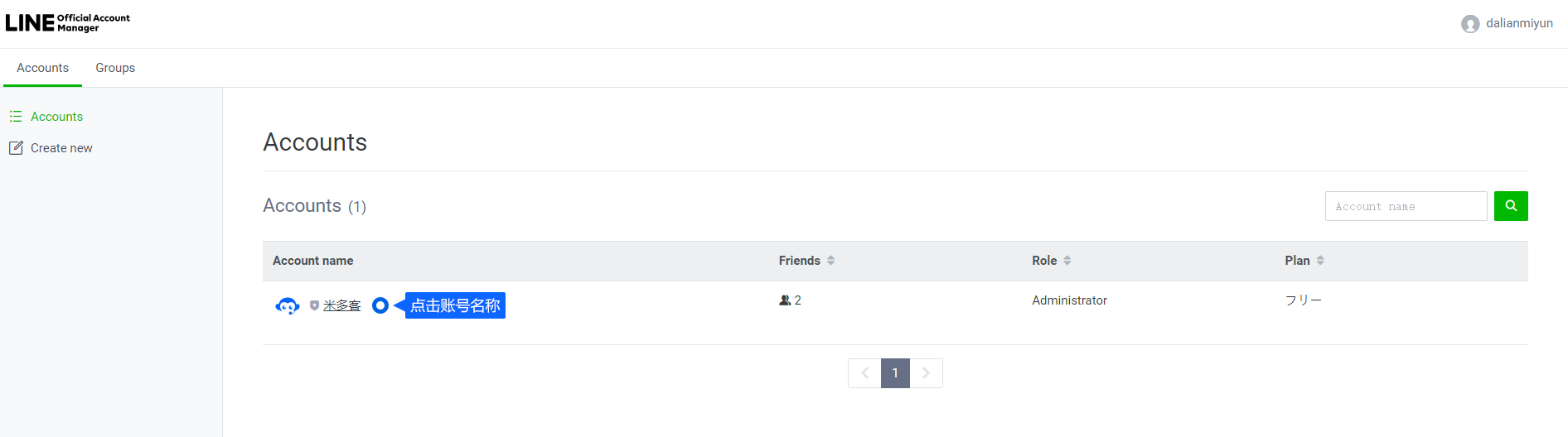 创建完成后,登录账号并点击列表的官方账号名称。