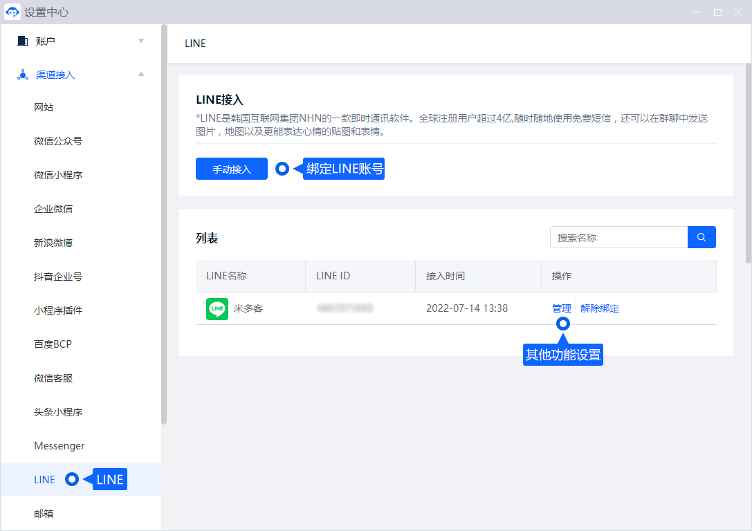 设置完成后,将【Channel ID】和【Channel secret】字段绑定至米多客LINE渠道页面中。
