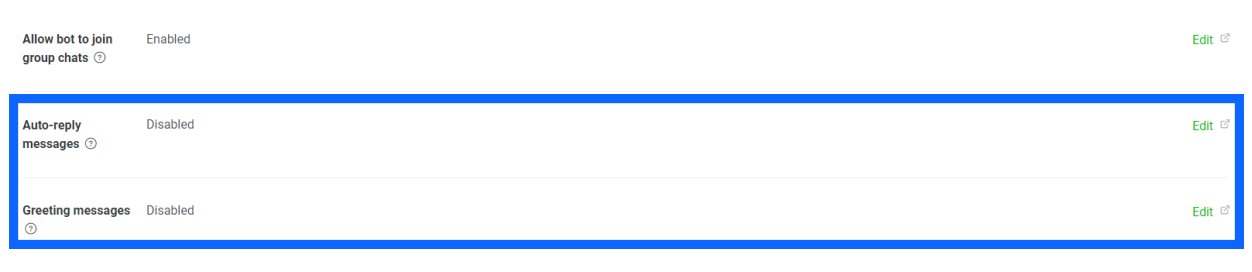 【Auto-reply messages(自动回复)】与【Greeting messages(问候语)】设置为Disabled状态。二者为管理后台自动设置的属性,米多客已通过接口支持自动回复和问候语,无需管理后台设置。