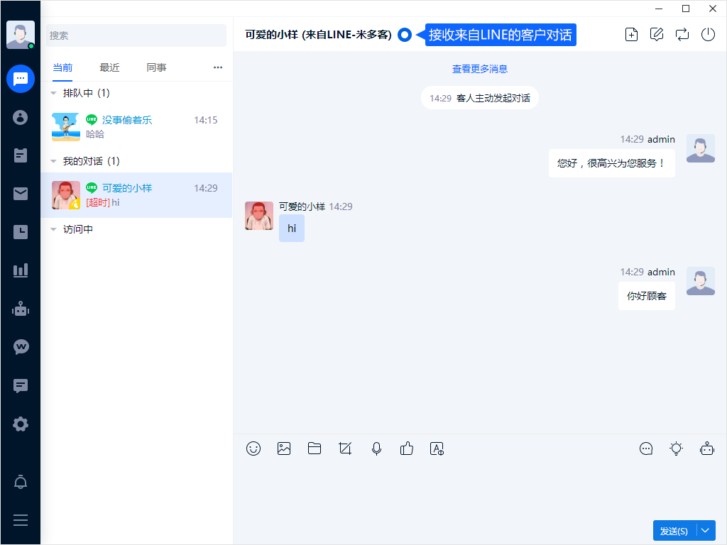 客人通过LINE发送消息,客服将在对话列表中及时收到对话内容。
